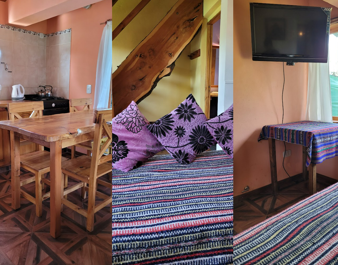 Dos Habitaciones , una doble con balcón a las montañas y una triple, sexta cama en planta baja , amoblada , heladera, calefacción y agua Caliente las 24 hs, Tv Cable, Wifi, estacionamiento interno, patio , parrilla, incluye ropa de cama , no incluye toallas.